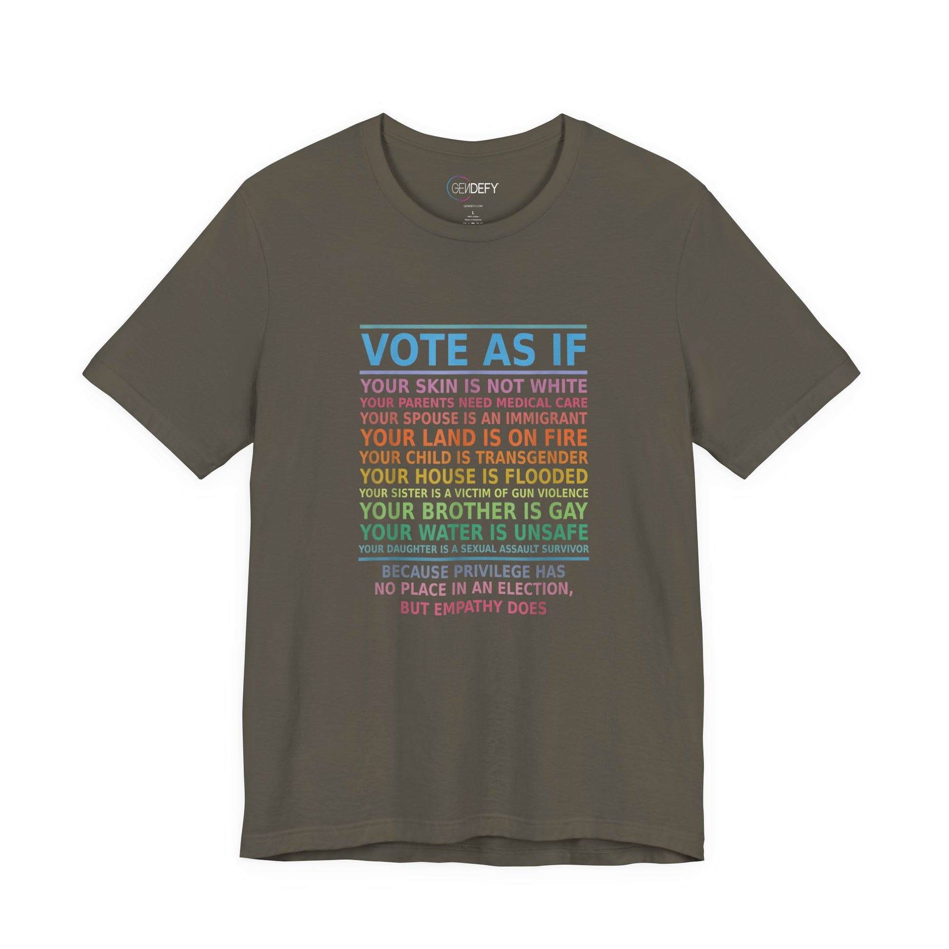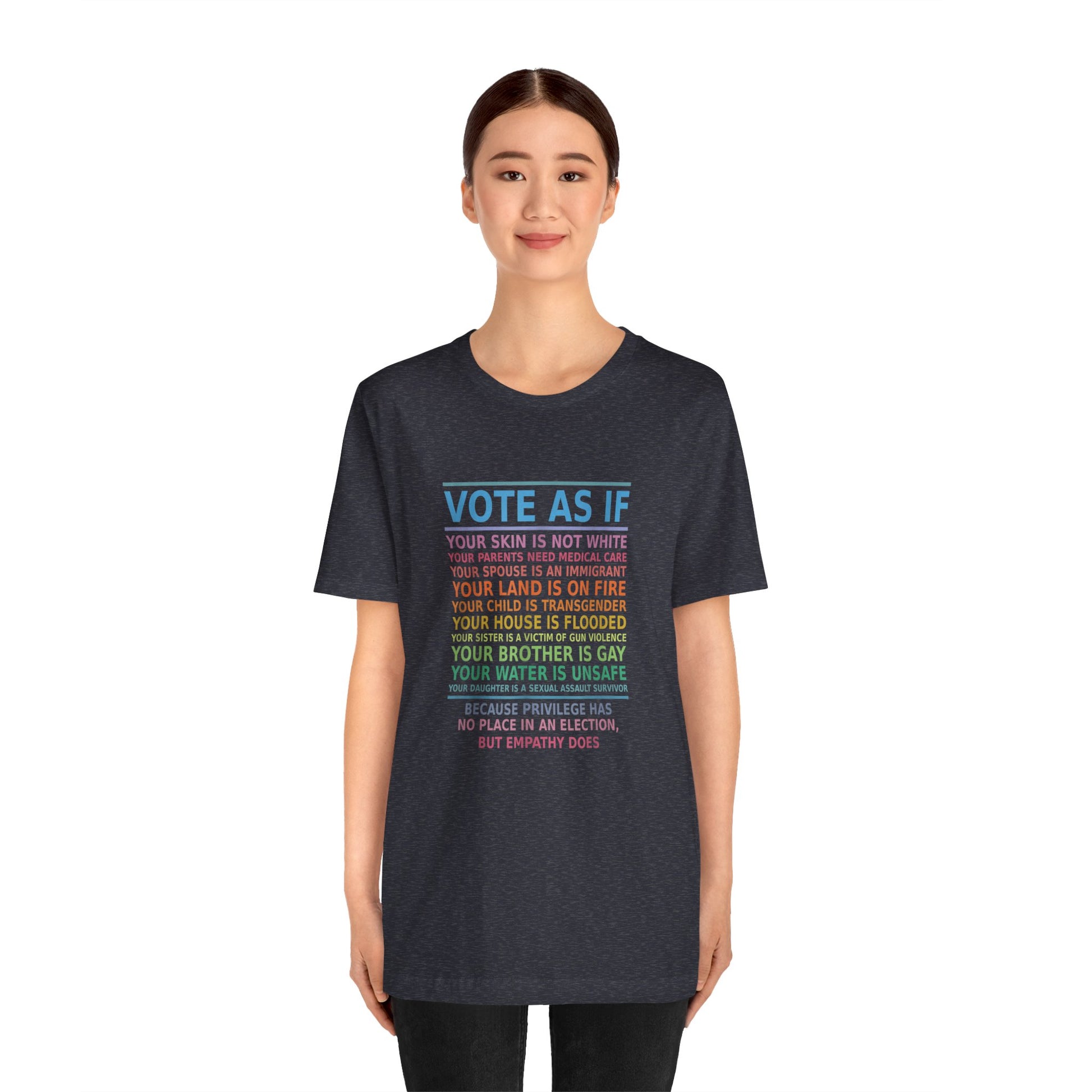 Make a powerful statement and inspire action with the "Vote with Empathy" t-shirt. Featuring a bold, thought-provoking design, this shirt reminds us to vote with compassion and awareness of the challenges faced by others. The text speaks to the heart, urging us to prioritize empathy over privilege in every election.