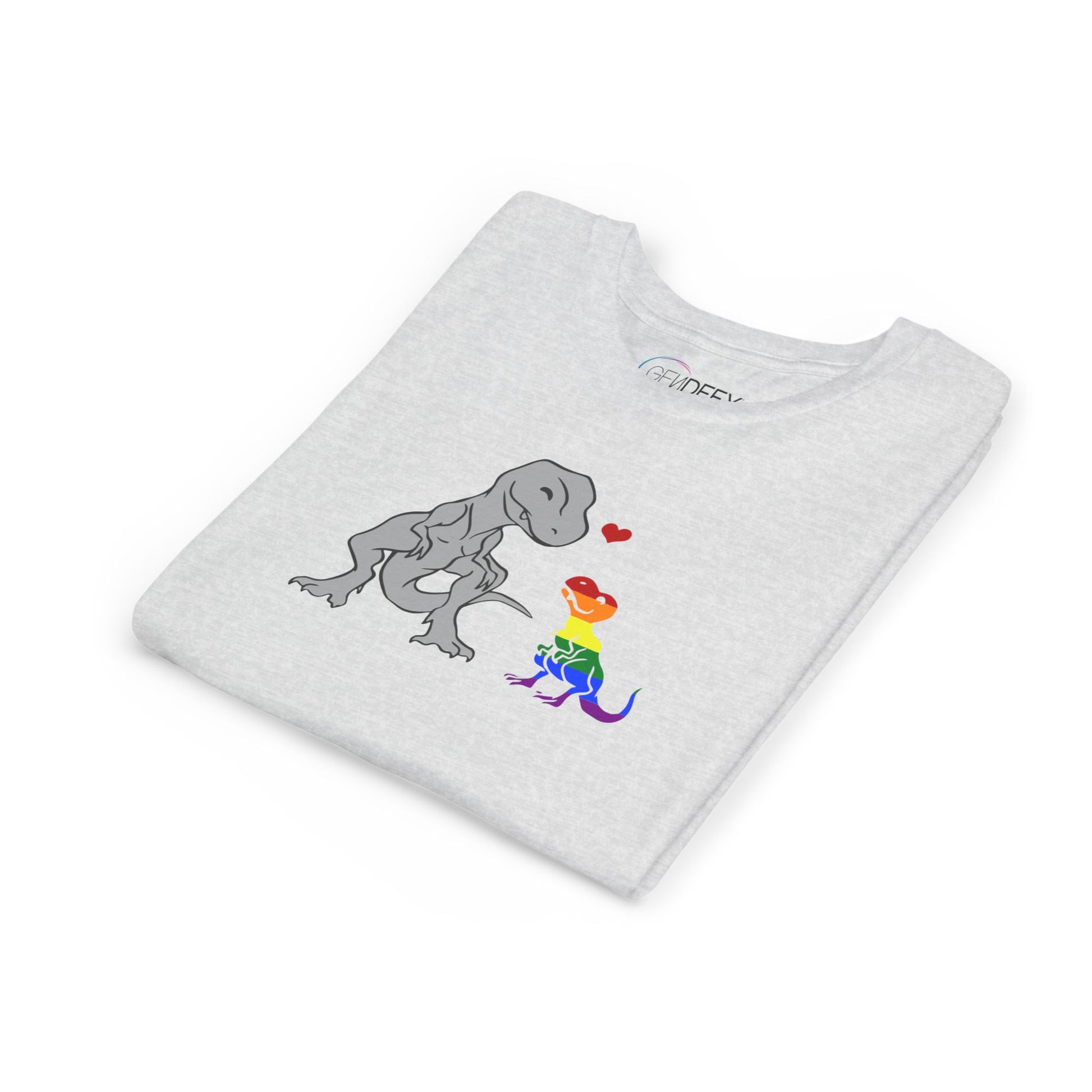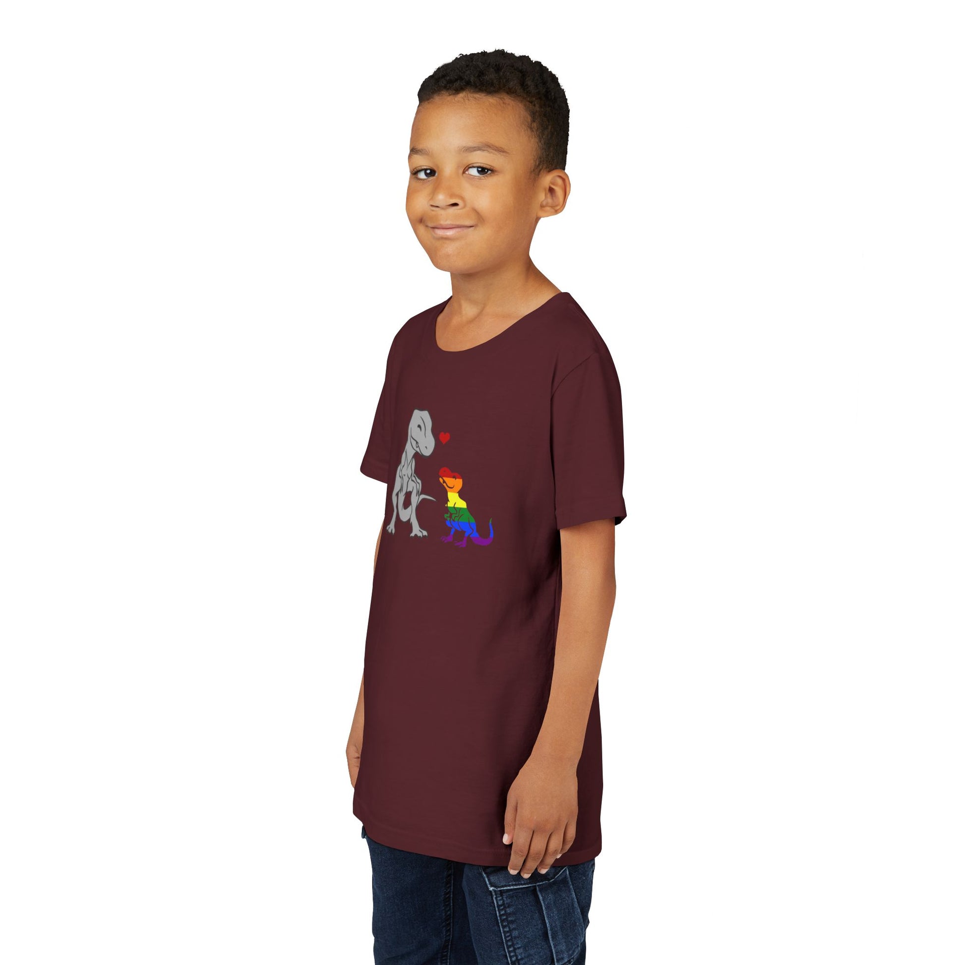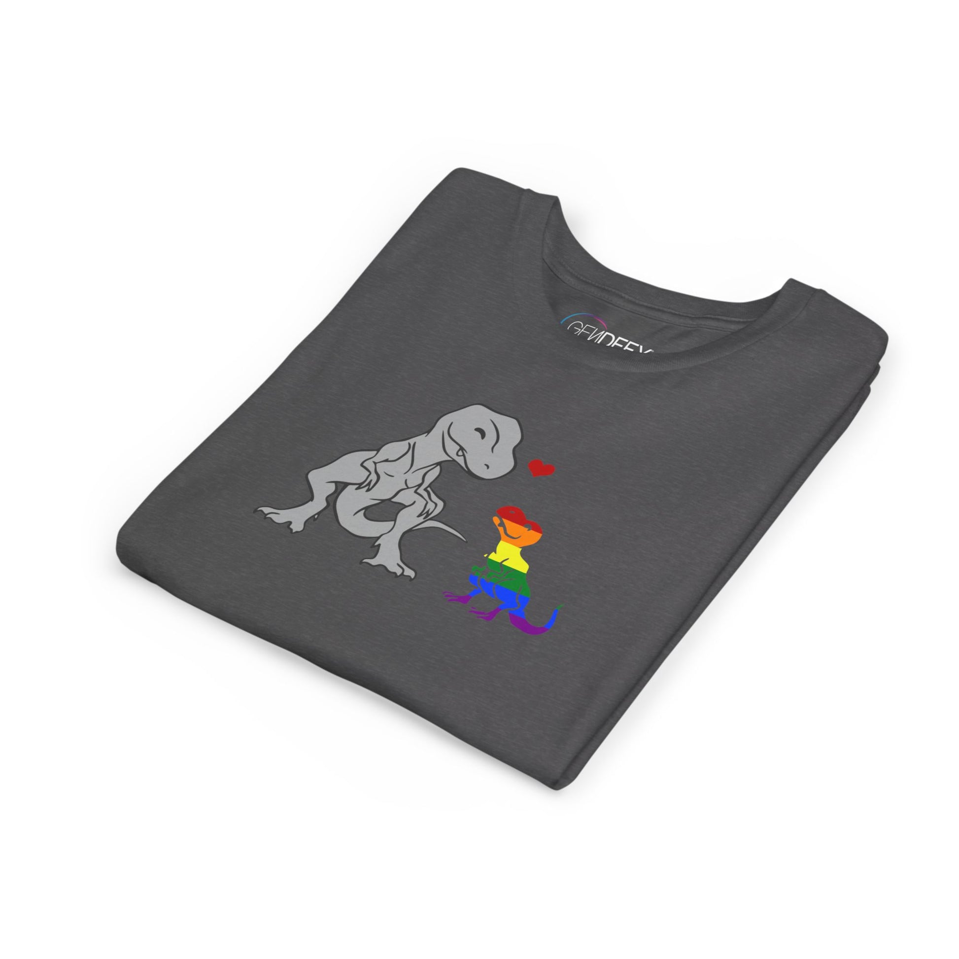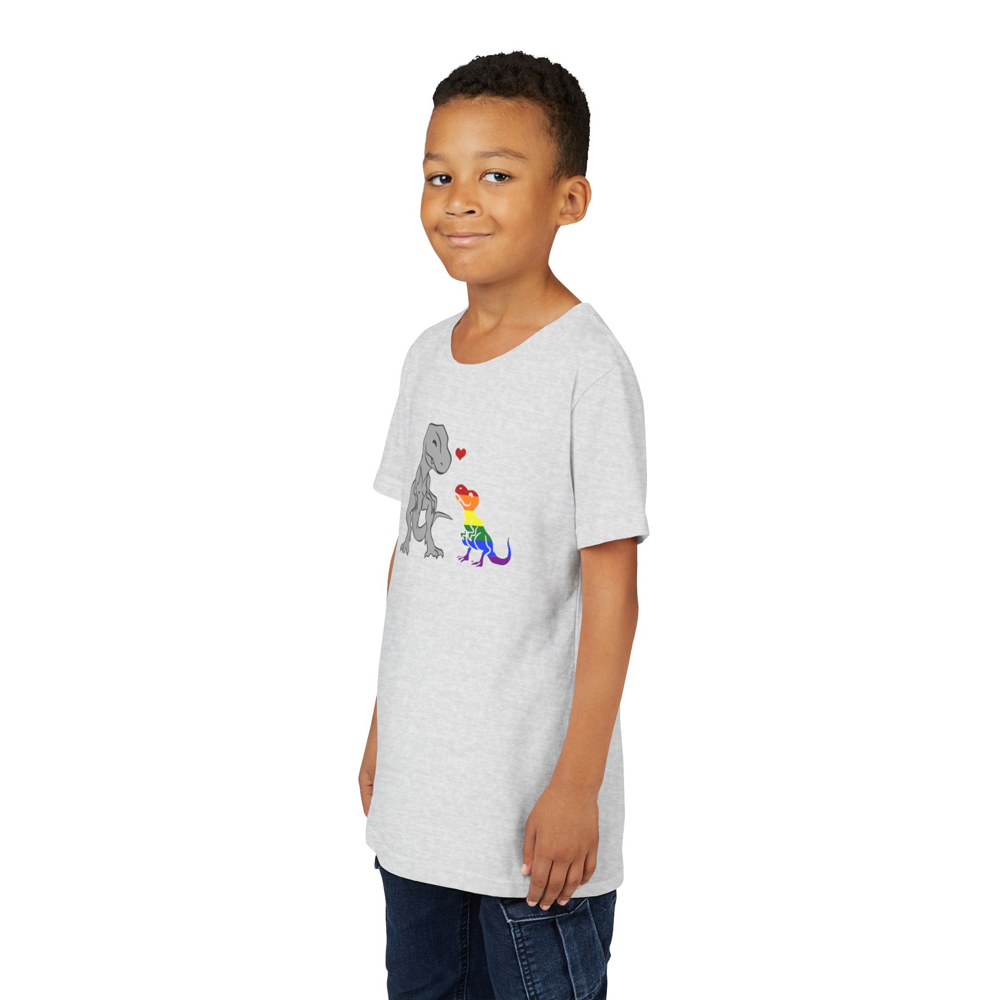Celebrate love and individuality with our "Mama Rex and Baby Rainbow Rex" youth t-shirt! This adorable design features a gray mama T-rex lovingly gazing at her colorful baby rainbow T-rex, with a bright red heart connecting them. Perfect for kids who love dinosaurs and value family, acceptance, and pride, this shirt is as meaningful as it is fun.